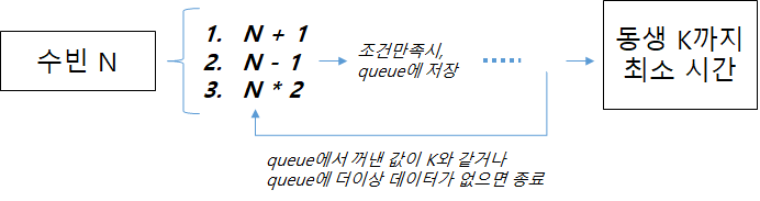 1. 수빈이와 동생 위치 N,K를 입력받는다.