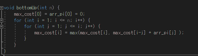 결과적으로 위 사진처럼 이중포문으로 구성이 되고, 점화식은 MAX_COST(i)= MAX(MAX_COST(i) , MAX_COST(i-j) + P(j))가 된다.