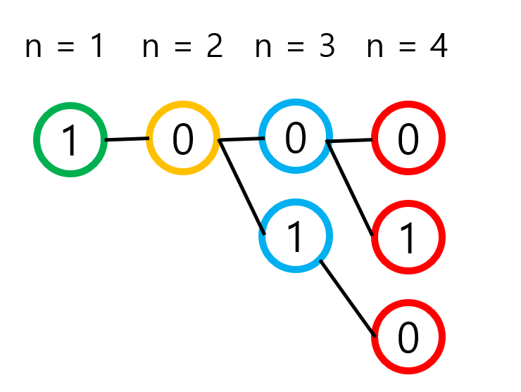 - 이친수에서는 1이 두 번 연속으로 나타나지 않는다. 즉, 11을 부분 문자열로 갖지 않는다.