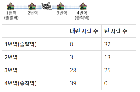 예를 들어, 위와 같은 경우를 살펴보자. 이 경우, 기차 안에 사람이 가장 많은 때는 2번역에서 3명의 사람이 기차에서 내리고, 13명의 사람이 기차에 탔을 때로, 총 42명의 사람이 기차 안에 있다.