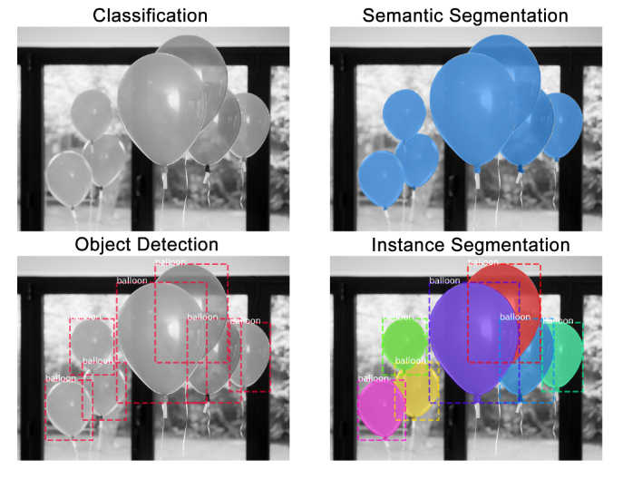 - Instance Segmentation: There are 7 balloons at these locations, and these are the pixels that belong to each one.